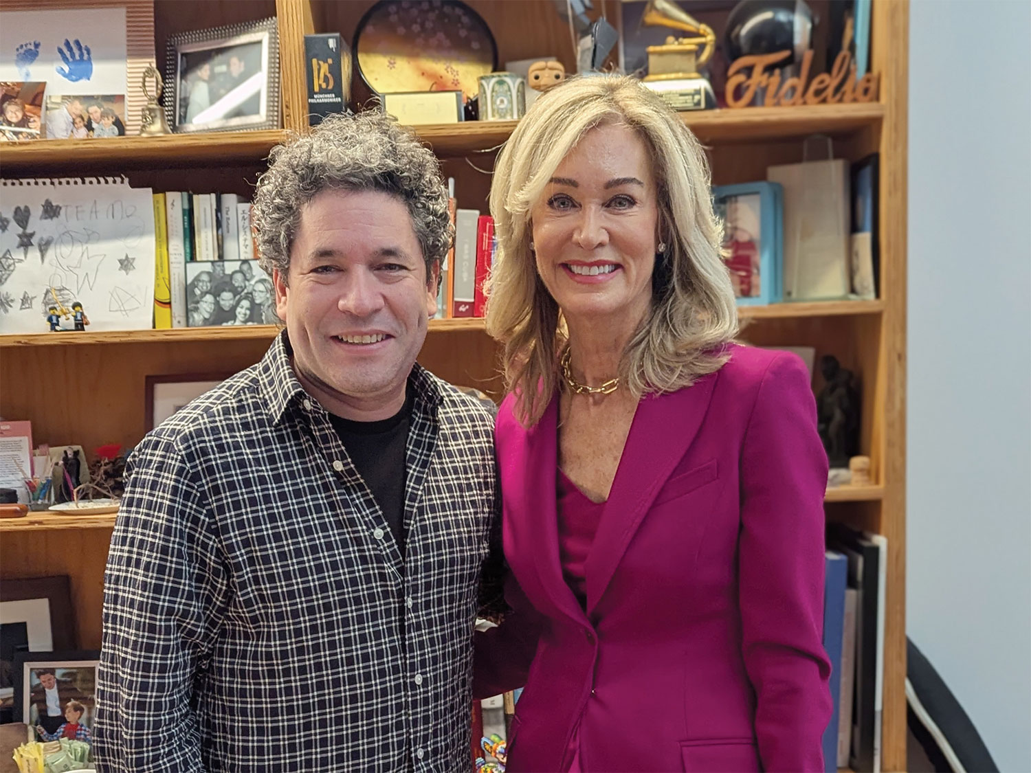 Our time together was evaporating. We ventured toward his bookshelves, and I spotted his first Grammy, for Best Orchestra Performance in 2011, resting prominently as well as his most recent Grammy, one of three won in 2025, awarded for his conducting of the LA Philharmonic. There was a photo of him giving a speech at the White House honoring his friend José Andrés accepting the Medal of Freedom, and other prizes and awards from world leaders such as the President of Chile, and the President of France.